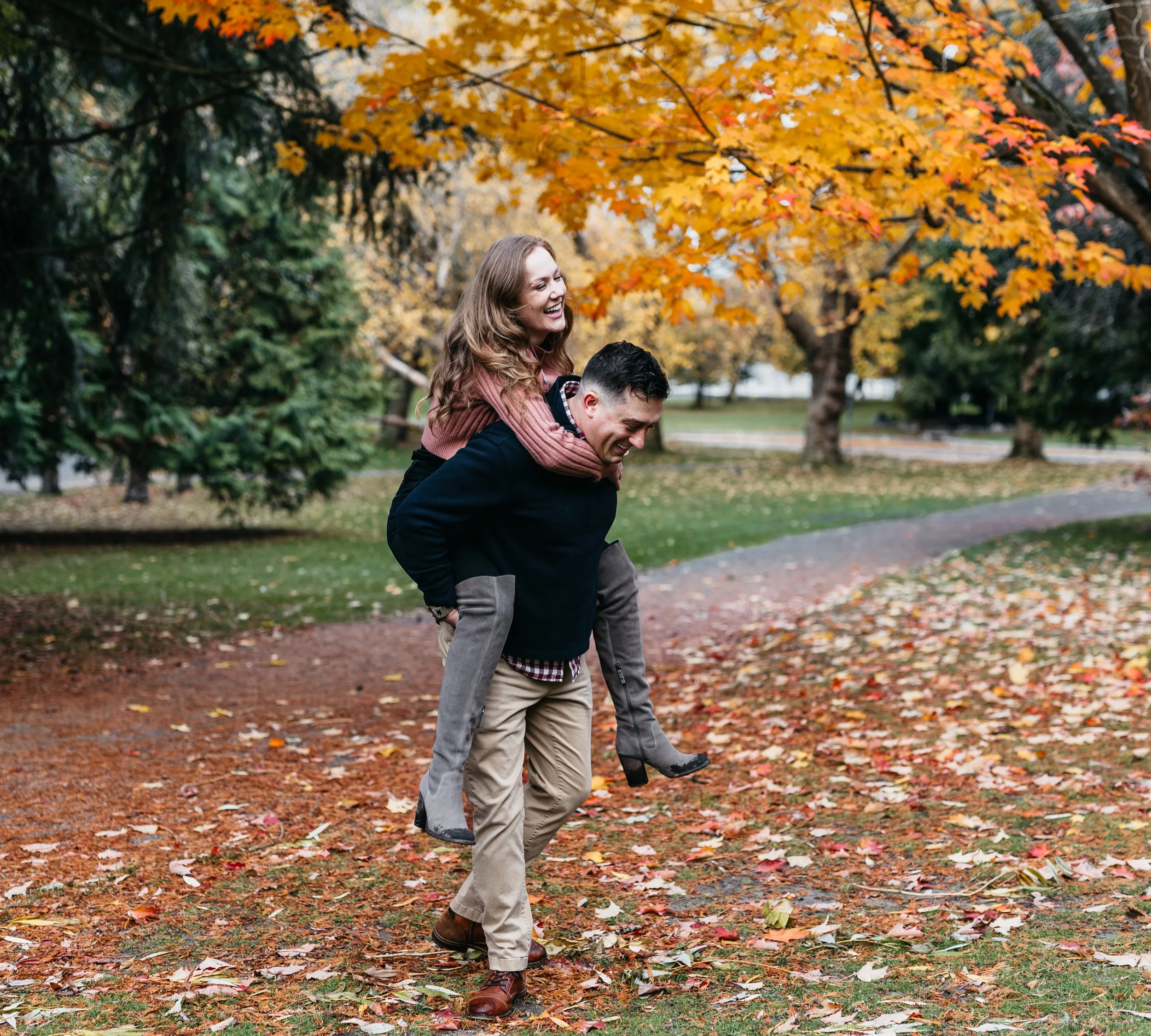 This park is so beautiful during the fall. The fall colors are absolutely gorgeous, and there’s so much you can do with the trees, the park trail, and the lake. The trees that show so a lot of fall colors are perfect for framing your subjects and can be incorporated as foreground to add layers and bring visual interest into the photos. Because the area is so open, I can move around and get different angles instead of just straight on the couple and the background will still look nice and clean!